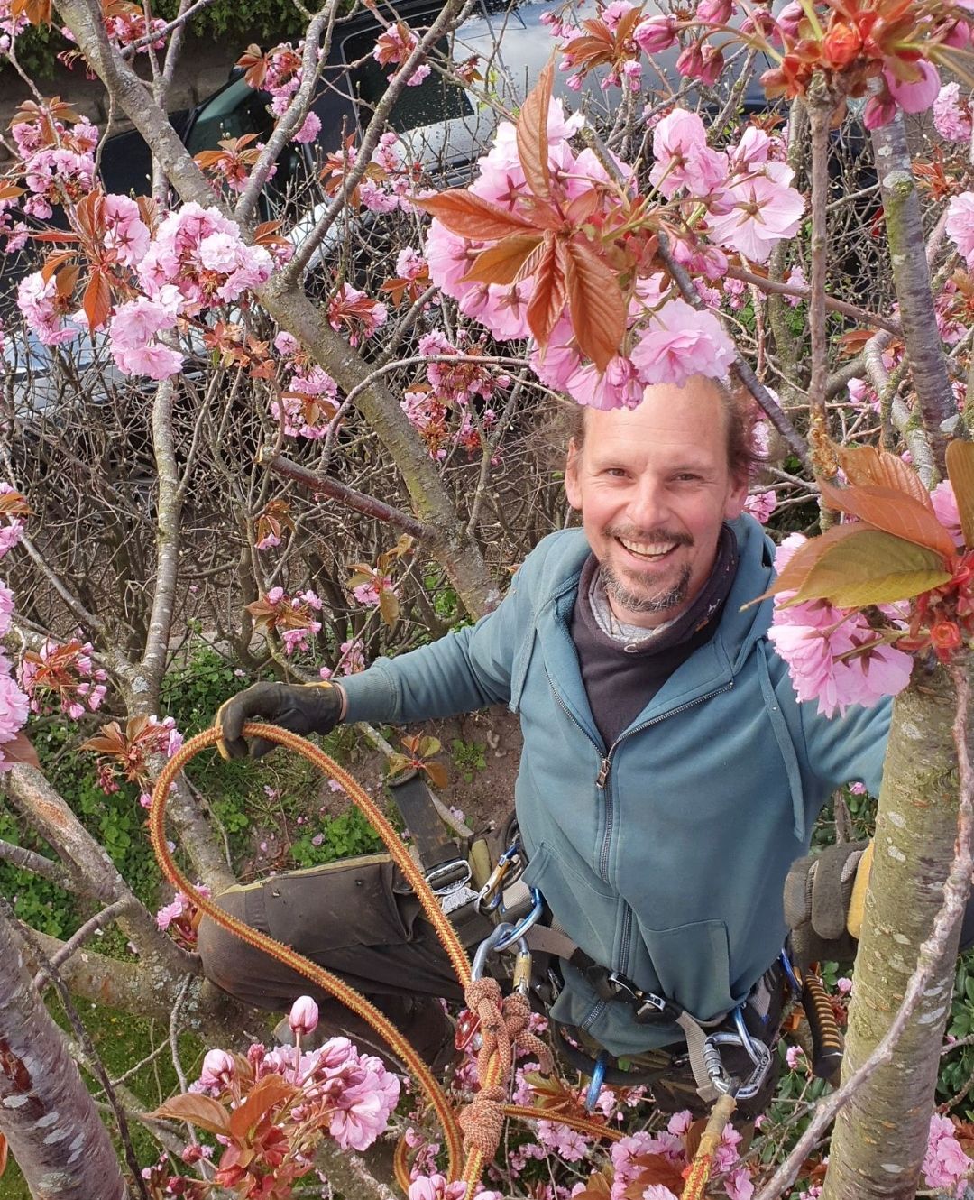 Daniel i ett blommande körsbär i Helsingborg.